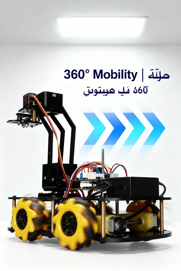 مزود بأربع عجلات ميكانوم عالية الجودة، يحقق الروبوت حركة كاملة بزاوية 360 درجة: للأمام، للخلف، للجانبين، قطريًا، وفي مكانه. يحاكي هذا الهيكل روبوتات المركبات الموجهة آليًا الصناعية والمستودعات، مما يتيح تنقلًا دقيقًا وتوليفًا لمتجهات الحركة. تُدار كل عجلة بواسطة محرك مُشفّر مزود بتحكم في السرعة بتقنية تعديل عرض النبضة (PWM) وتغذية راجعة من خلال PID، مما يوفر دقة في السرعة وعزم الدوران والثبات. يتيح نظام الحركة الشامل للطلاب فهم الحركية الميكانيكية، والتحكم في الحلقة المغلقة، وخوارزميات التوازن الديناميكي. بفضل محاور مطاطية ومعدنية مانعة للانزلاق، تعمل المنصة بكفاءة على البلاط والسجاد والأرضيات الخشبية، مما يضمن ثباتًا في الحركة على مستوى احترافي أثناء الاستخدام في مختبرات الروبوتات أو المسابقات.