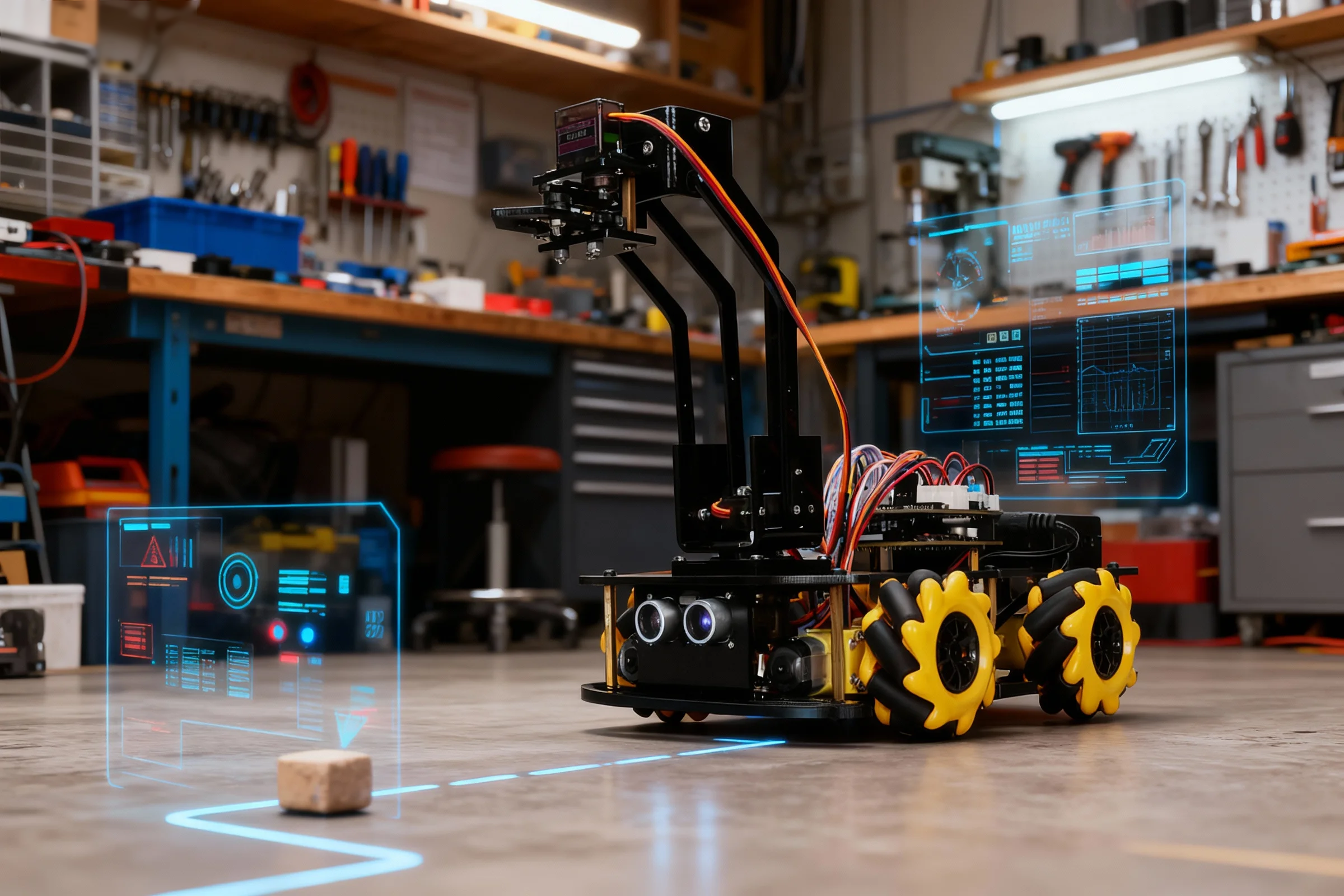 يسمح هيكل عجلة الميكانوم بالحركة في جميع الاتجاهات باستخدام نظام التحكم بمزيج المتجهات، مُحاكيًا بذلك نماذج الملاحة الروبوتية الواقعية. يُوفر مُشفّر كل عجلة تغذية راجعة للتحكم بنظام PID ذي الحلقة المغلقة، مما يضمن دقة حركة ثابتة. يُمكن برمجة الذراع الروبوتية للتنسيق مع الوحدة البصرية، مما يُشكّل سير عمل "الذكاء الاصطناعي يرى، والذراع يتصرف". على سبيل المثال، عندما تُحدد الكاميرا جسمًا أحمر، يلتقطه الذراع تلقائيًا ويُعيد تحديد موقعه - وهو مثال رائع على أنظمة التوجيه البصري المُتكاملة.