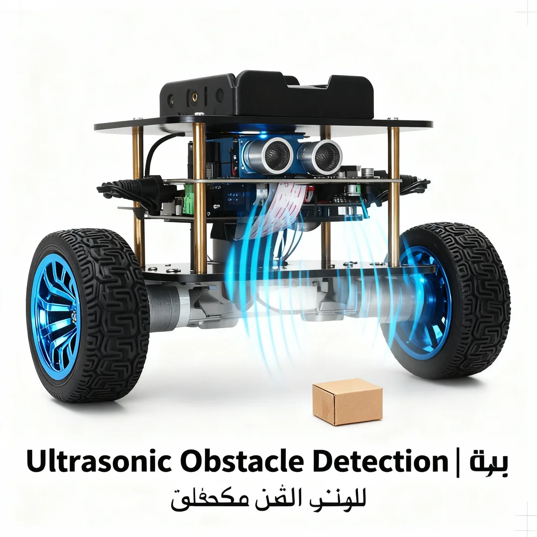 الروبوت مزود بمستشعر فوق صوتي HC-SR04، ويمسح محيطه لاكتشاف العوائق وقياس المسافة باستخدام انعكاس الصدى. يقوم البرنامج المدمج بضبط مسار الروبوت تلقائيًا أو إيقافه عند اكتشاف جسم ما، مما يمنع الاصطدامات. يمكن للطلاب تصور بيانات المسافة، وتعلم توقيت الإشارات الرقمية، وفهم كيفية دمج أنظمة الملاحة ذاتية القيادة بين تغذية المستشعر ومنطق اتخاذ القرار. تشكل هذه الوحدة أساسًا لتطوير سلوكيات القيادة الذاتية، وهي مهارة أساسية في روبوتات الذكاء الاصطناعي والأنظمة المدمجة.